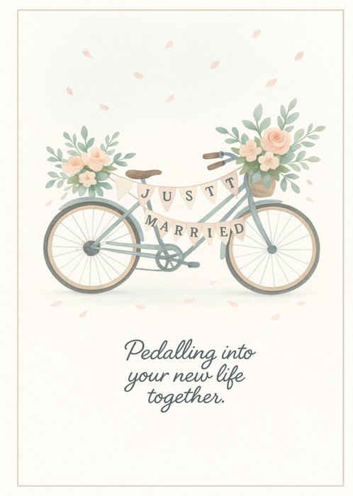 Featuring an illustrated bicycle decorated with flowers, foliage, bunting, script text & scattered petals on a white coloured background.