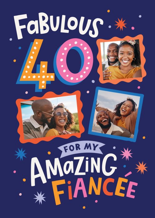 This greeting card features a dark blue background decorated with colourful stars, bursts, and dots, and includes three photo upload areas in different shapes across the centre.