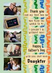 Front of card: Father's Day Photo Upload Card Five photo frames on a colourful pattern background. Text reads: "Thank you for all that you do you mean the world to me I couldn't be without you! Happy Father's Day with love from your daughter". 'Daughter' can be personalised!