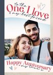 Front of card: Anniversary Photo Upload Card Featuring a large photo frame with handwritten typography and hearts. Text reads: "To the one I love & my best friend happy anniversary".