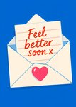 A greeting card showing an open cream envelope with a lined note peeking out and a pink heart seal, centred on a bright royal blue background.