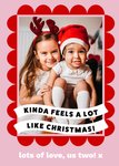 An endearing and cute Christmas card featuring a large photo upload area in the centre inside a frame made up of red scalloped border, with two white text banners overlapping the picture frame.