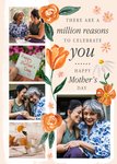 Front of card: Mother's Day Photo Upload Card Five photo frames with a watercolour illustration of flowers. Text reads: "There are a million reasons to celebrate you happy Mother's Day".
