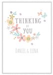 Front of card: Thinking Of You Card Floral illustration on a white background. Text reads: "Thinking of you" and "Daniel & Elena". 'Daniel & Elena' can be personalised!