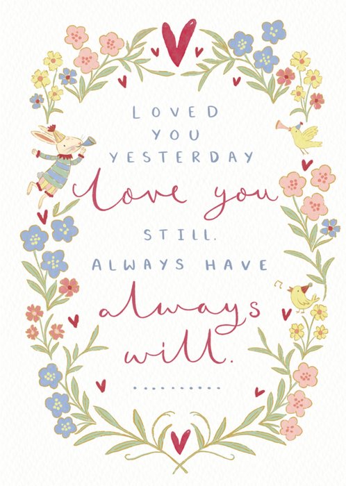 Featuring a hand-painted floral wreath with red hearts, a trumpeting rabbit and two small birds on a white background. In the centre is blue and red, hand written style text.