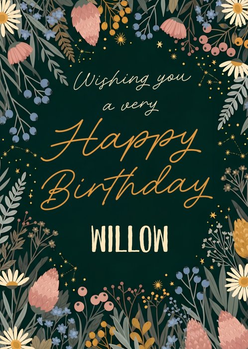 Featuring hand-lettered birthday text surrounded by an illustrated wildflower and foliage border, with star constellations and small sparkles on a black background.