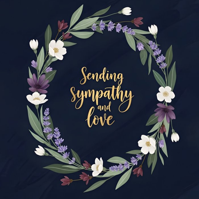 Featuring a floral wreath of white and purple flowers with green leaves surrounding gold hand written text on a dark blue background.
