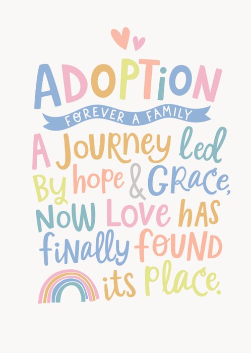 A modern design featuring pastel hand-lettered typography with two hearts and a small rainbow on an off white background.