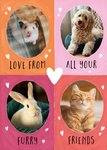 Front of card: From Your Pets Photo Upload Valentine's Day Card Featuring four colourful sections with oval photo frames. Text reads: "Love from all your furry friends".