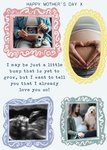 Front of card: Mother's Day Photo Upload Card Four frilly photo frames with a sentimental message. Text reads: "Happy mother's day x" and "I may be just a little bump that is yet to grow, but I want to tell you that I already love you so!".