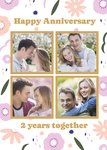 Front of card: Happy Anniversary Photo Upload Card 4 photo frames on a flowery pattern background. Text reads: "Happy Anniversary 2 years together". All text can be personalised!