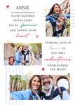 Front of card: Featuring a sentimental verse with three photo frames on a white background. Text reads: "Annie close together or far apart you're forever and always in my heart sending lots of love to you this Valentine's Day from across the miles". 'Annie' can be personalised!