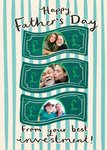 A humorous Father's Day card featuring three illustrated banknotes, each with a circular photo upload frame. The background has a bold teal and cream vertical stripe pattern, and playful handwritten-style text delivers the cheeky message “From your best investment!” — perfect for kids or grown-up children to send to their dad with a smile.