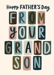 A bold and modern Father's Day card with a heartfelt message from a grandson. The design features colourful block letters arranged in a grid, each with a textured paint effect, spelling out “From Your Grandson” beneath a hand-lettered “Happy Father's Day” message. Set against a soft cream background in warm, earthy tones.