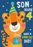 Fun Illustration Tiger Party Hat Son You're 4 Birthday Card