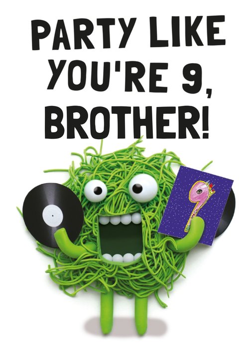 A fun and chaotic Birthday Day card to a brother featuring an illustration of a funny-looking monster character made up of green stringy material that looks like green spaghetti holding a vinyl record in one hand and the record's album sleeve in the other, the sleeve has the number 9 on the cover.