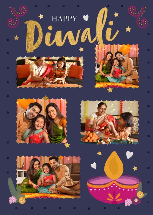 Front of card: A bold and joyful Diwali card featuring hand-illustrated Diwali iconography with added gold foil text and stars. There are five photo upload areas in a collage with scalloped edge border.