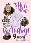 A fun and delightful Photo Upload Birthday card featuring a light purple background adorned with small white dots, creating a festive and inviting atmosphere. At the centre, a charming shell character with open arms adds a whimsical touch, symbolising the joy of celebration. There are three photo upload areas in frames with scalloped edges. The main text, displayed in a mix of fonts, is written in bold purple letters, playfully punning on the word 'celebrate' to match the shell theme. The overall design is cheerful and vibrant, perfectly suited to bring a smile to a young girl's face on her birthday.