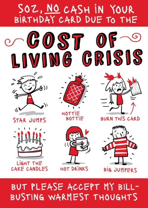 A playful cartoon-style design featuring red, black, and white illustrations. The layout includes doodles of people doing star jumps, drinking from a mug, wearing a big jumper, lighting cake candles, holding a hot water bottle, and burning the card — all labelled beneath each image. The background is white with bold red and black handwritten-style text referencing the cost-of-living crisis.