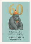 A teal background with a hand-drawn gorilla wearing an orange party hat and bow, large golden “60” text, and a humorous birthday caption.