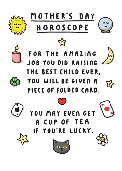 "Mother's day horoscope. For the amazing job you did raising the best child ever, you will be given a piece of folded card. You may even get a cup of tea if you're lucky."