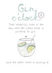 Card reads: "Gin o'clock. That wonderful time of the day when the little hand is pointing to the gin... ...and the other hand is pouring it"