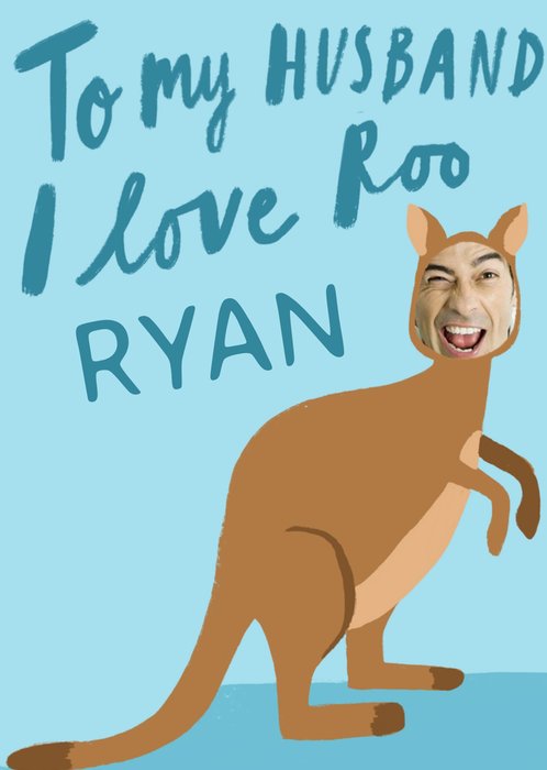Front of card: 'To my Husband' Photo Upload Valentine's Day Card Funny illustration of a kangeroo with a face photo upload. Text reads: "To my Husband I love roo Ryan". 'Ryan' can be personalised!