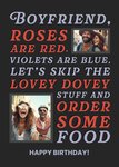 "Boyfriend, roses are red, violets are blue, let's skip the lovey dovey stuff and order some food. Happy Birthday!"