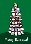 Features an illustrated Christmas tree made out of rugby balls on a green background. Text reads:"Merry Ruck-mas!:"