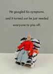 Front of card: Funny photograph of male doll with in armchair Text reads: "He googled his symptoms, and it turned out he just needed everyone to piss off." Back of card: Bold and Bright logo. Moonpig logo