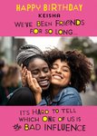 Front of card: Large photo upload area in centre of card with black editable name at the top and a funny message in funky black and yellow text above and below photo, all on a pink tonal patterned background. Text reads: "Happy Birthday Keisha. We’ve been friends for so long… it’s hard to tell which one of us is the bad influence"< br>With customisable name