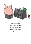 Front of card: Featuring a funny cartoon of a giant turkey being stuffed into a small air fryer drawer. Text reads: "Oh I wish it could be Christmas air-fry day, Dave!"