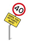 Text in the sign reads: "40. Oops. You Hit Forty, Mate!".
