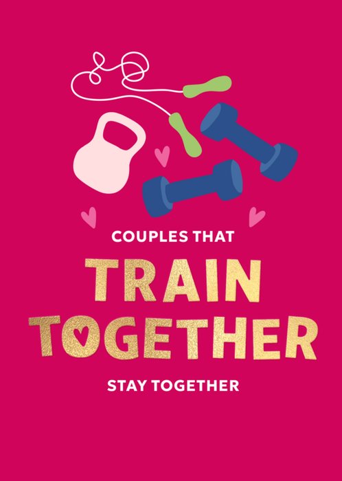 Featuring illustrations of a kettlebell, skipping rope, and two dumbbells with small hearts and bold gold glitter effect typography on a bright pink background.