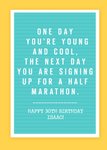 Text reads: "One day you're young and cool, the next day you are signing up for a half marathon. Happy 30th Birthday Isaac!"