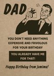 Front of card: Illustration of a man holding gift box with black typography on brown background Text reads: "DAD YOU DON'T NEED ANYTHING EXPENSIVE AND FRIVOLOUS FOR YOUR BIRTHDAY. YOU ALREADY HAVE ME FOR THAT! Happy Birthday from Jemima!" With editable text.