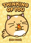 A delightful and fun Thinking Of You card featuring an illustration of a round, cuddly, contented Kawakii-style cat holding a slice of pizza against a sunshine-yellow background adorned with subtle outlines of various pizza toppings. The cat’s eyes are closed in bliss, and its mouth forms an open, happy expression. Above the cat, bold lettering in a playful font conveys a sense of affection and warmth. Below the cat, there are smaller letters in the same style. The overall mood of the image is playful, whimsical, and affectionate—a delightful combination of feline charm and pizza indulgence.