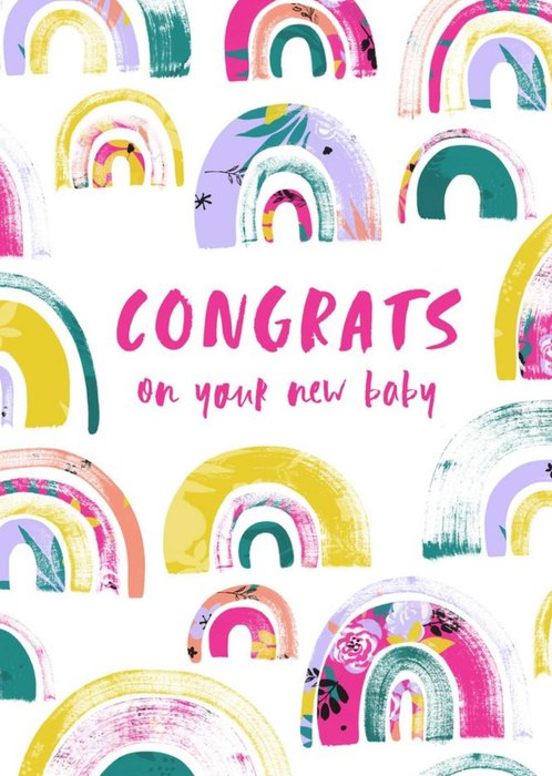 Features illustrations of multi-coloured rainbows on a white background. Has text in the center of the card. Text reads: "Congrats On Your New Baby"