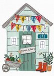 Card shows an illustration of a garden shed draped in happy father's day bunting. There is a pair of wellies and a wheel barrow on either side of the shed, and a text editable sign with 'Love Julie x' hanging from the shed door