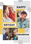 Front of card: Three photo frames surrounded by black, yellow and grey geometric shapes. Text reads: "Happy birthday Grandson". 'Grandson' can be personalised!