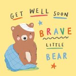 A playful design featuring an illustration of a brown bear with a head bandage wrapped in a blue blanket, with colourful hand-drawn lettering and stars on a pale yellow background.