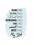 Gift Delivery typographic card for your Dad. The non editable caption reads Fun Dad, Wise Dad, Kind Dad, Strong Dad, Fair Dad, Sweet Dad, Best Dad, My Dad. The card background colour is white with a pale blue brush stroke panel.