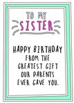 Go La La Simple typographic Birthday Card. The non editable caption reads To My Sister. Happy Birthday From The Greatest Gift Our Parents Ever Gave You. The card has a bright green border and a white background.