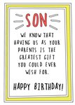 Go La La Simple typographic Birthday Card. The non editable caption reads Son. We Know That Having You As Parents Is The Greatest Gift You Could Ever Wish For. Happy Birthday! The card has a yellow border and a white background.