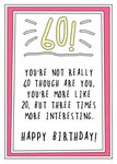 Go La La Simple typographic Birthday Card. The non editable caption reads 60! You're Not Really 60 Though Are You, You're More Like 20, But Three Times More Interesting. Happy Birthday! The card has a red border and a white background.