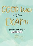 A cheerful and supportive good luck card with golden gradient text on a soft turquoise background. It features a handwritten message and a smiling shooting star illustration, making it a lovely way to encourage someone ahead of their exams.