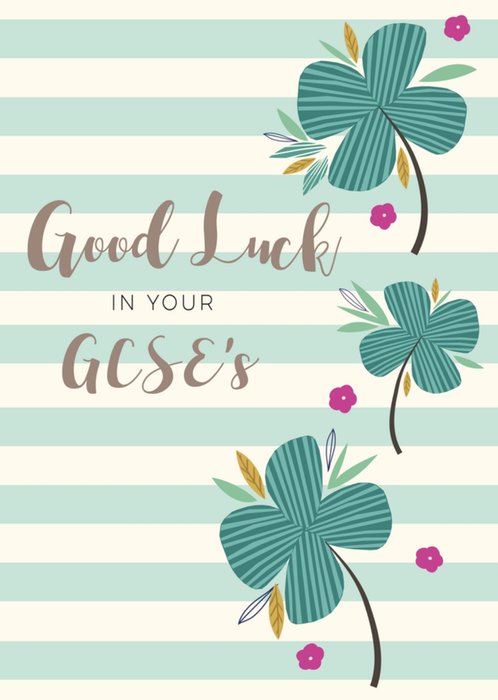 A stylish and calming GCSE good luck card featuring green striped four-leaf clovers and pink flowers on a cream and mint striped background. The message is presented in elegant, mixed fonts for a soft and encouraging feel.