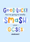 A fun and energetic greeting card with colourful, quirky lettering cheering on exam success, set on a light blue background with playful customisation for a student's name.