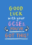 An upbeat and encouraging GCSE exam good luck card. Features cheerful hand-lettered text in yellow, pink, orange and white on a bright blue background. Arrows and underlining help to emphasise the motivating message.