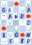 A bold and graphic Father's Day card featuring the words “Grandad Legend” spelled out across a playful checkerboard pattern. The design includes light blue and white squares, scattered red stars, and a variety of expressive smiley faces. A vibrant and modern choice for a legendary grandad.